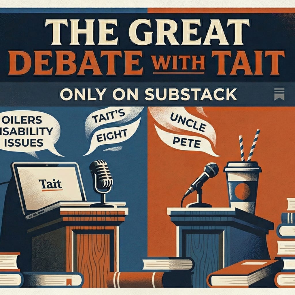 Playback speed×Share postShare post at current timeShare from 0:000:00/Transcript3 In Canada National Volunteer Week starts April 20. My friends Matt Jobb and Ron MacLean volunteered their time to tell my story of how volunteers changed my life. Please email me for more information Cam TaitApr 11, 20263ShareTranscriptTHE GREAT DEBATE WITH TAIT is a reader-supported publication. To receive new posts and support my work, consider becoming a free or paid subscriber.SubscribeThanks for reading THE GREAT DEBATE WITH TAIT! This post is public so feel free to share it.ShareLeave a commentDiscussion about this videoCommentsRestacksJust a few minutes with Cam Ta Best-selling author and award-winning newspaper columnist Cam Tait doesn't speak clearly. His thoughts are read by A.I. and Cam produces his work Best-selling author and award-winning newspaper columnist Cam Tait doesn't speak clearly. His thoughts are read by A.I. and Cam produces his workSubscribeListen onSubstack AppSpotifyRSS FeedAppears in episodeCam TaitRecent EpisodesSaturday Cam 'n Eggs - The Saturday Sports Set Up - Sports 1440.ca - April 11, 2026: RORY, BROOKS, GREG AND OILERS ON APRIL 11Apr 11 • Cam TaitThe 2-Minute Warning - Jason Gregor Show - Sports 1440.ca - April 10, 2026: WE HAVE TO WHISPERApr 11 • Cam TaitCam 'n Eggs - April 9, 2026 - Kevin Karius Show - Sports 1440.ca: "We are whispering today because ..."Apr 9 • Cam Tait"Why I would not blame Connor McDavid if he left Edmonton." - 2 MINUTE WARNING - Jason Gregor Show - April 8 - Sports 1440.caApr 9 • Cam TaitCam'n Eggs - April 8, 2026 - Kevin Karius Show - Sports 1440.ca - Introducing Grandma Anderson, Steve Hamilton, Mystery Voice, Curious CamApr 8 • Cam TaitCam 'n Eggs - April 7,th -- 10:20 a.m. - Kevin Karius Show - Sports 1440 - THE DAY AFTER: THAT'S WHAT MATTERSApr 7 • Cam TaitThe April 6 Gift of Disability on 840 CFCWApr 6 • Cam Tait
